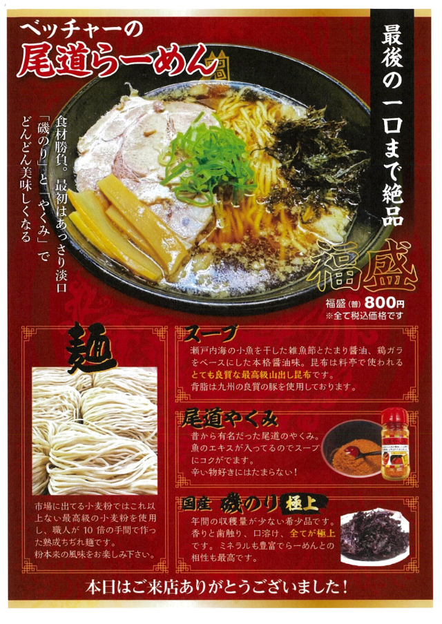 And also we want you to remember the good and old taste originated in Onomichi. Hot red pepper would be called Onomichi spices “Onomichi yakumi”,which was famous for its hotness and its unique flavour. So please enjoy the flavour with our ramen noodle, dried in the sunshine naturally, not by the machines.