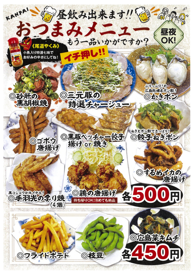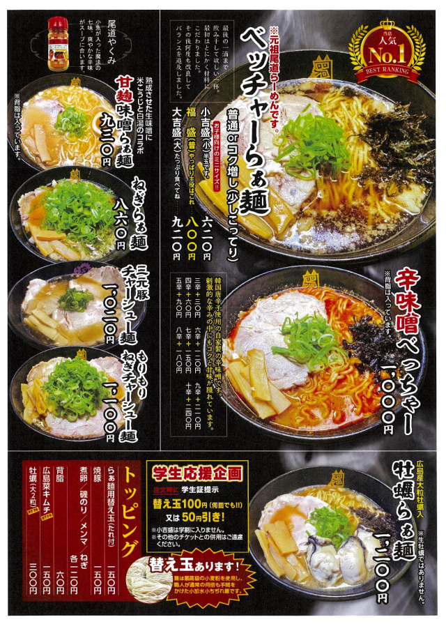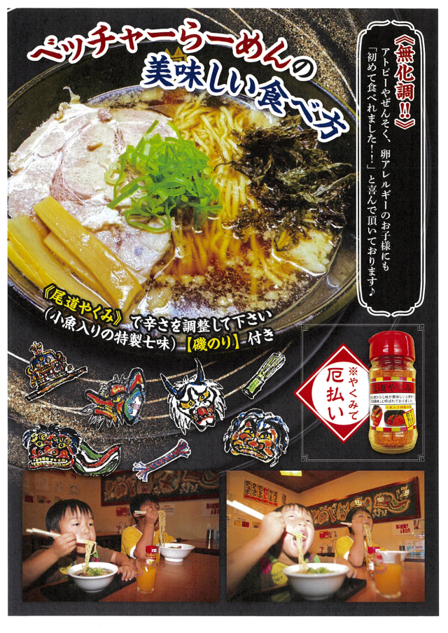 The flu will be soon away to be scared. Besides Our ramen has a lot of healthy points. Using much hot red pepper, dried sea lettuce caught in the Seto Inland Sea, (means fresh and clean) plus dried small fish as its topping, (we living here in Onomichi like eating small fish caught by ourselves but commercially on TV people tend to misunderstand that we like sea bream. Actually we eat chirimen or iriko, meaning small fish, so we want to make the real rocal ramen with fish extract. A lot of calcium is necessary for our body. Please add some of your favorite green vegetable or ham, corn as you like. Enjoy this ramen in your own style, but please be careful not to put too much hot red pepper on it. When you use all of them, that makes it ten times hotter, half would be five times hotter than usual.