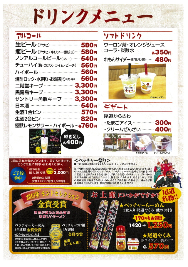 尾道ベッチャーつけ麺モンドセレクション2012年金賞受賞らーめん3年連続、つけ麺2年連続 ダブル受賞